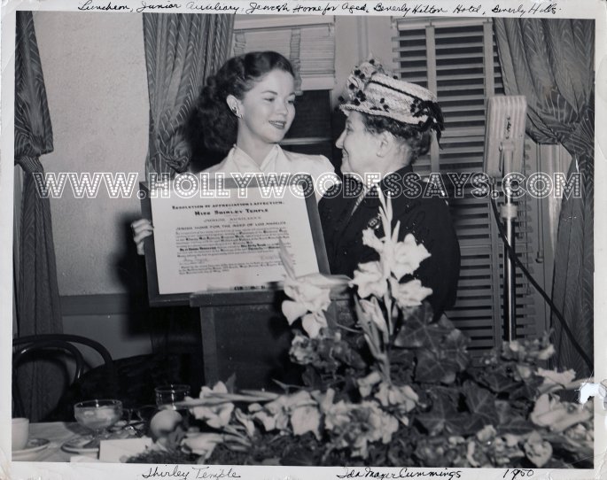 At first glance, this is a photo of a beloved child star being presented with a “Resolution of Appreciation and Affection” by my great-grandmother Ida Mayer Cummings on behalf of the Junior Auxiliary for the Jewish Home of the Aged.