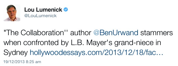 I went into this event with no expectations and certainly the only thing I came away with was a sense of personal pride that I showed up on behalf of the much maligned Jewish studio heads and executives, including Uncle Louis, who cannot speak for themselves and so defend their legacies against this callow book. Though the last few months have been exhausting, I am so glad I could bring the effort of so many directly to Urwand’s door for his one Australian appearance.