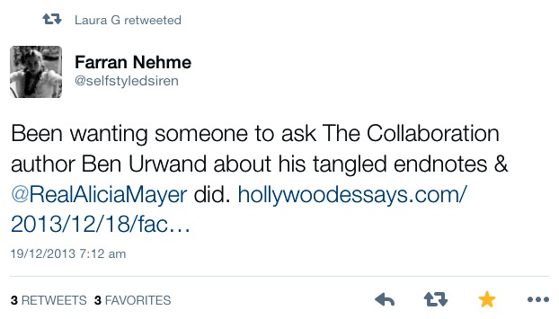 Interestingly, the next question again took up the word collaboration, but unfortunately she also followed with praise for the book’s endnotes when, in fact, they are like falling down the rabbit hole in Alice and Wonderland.