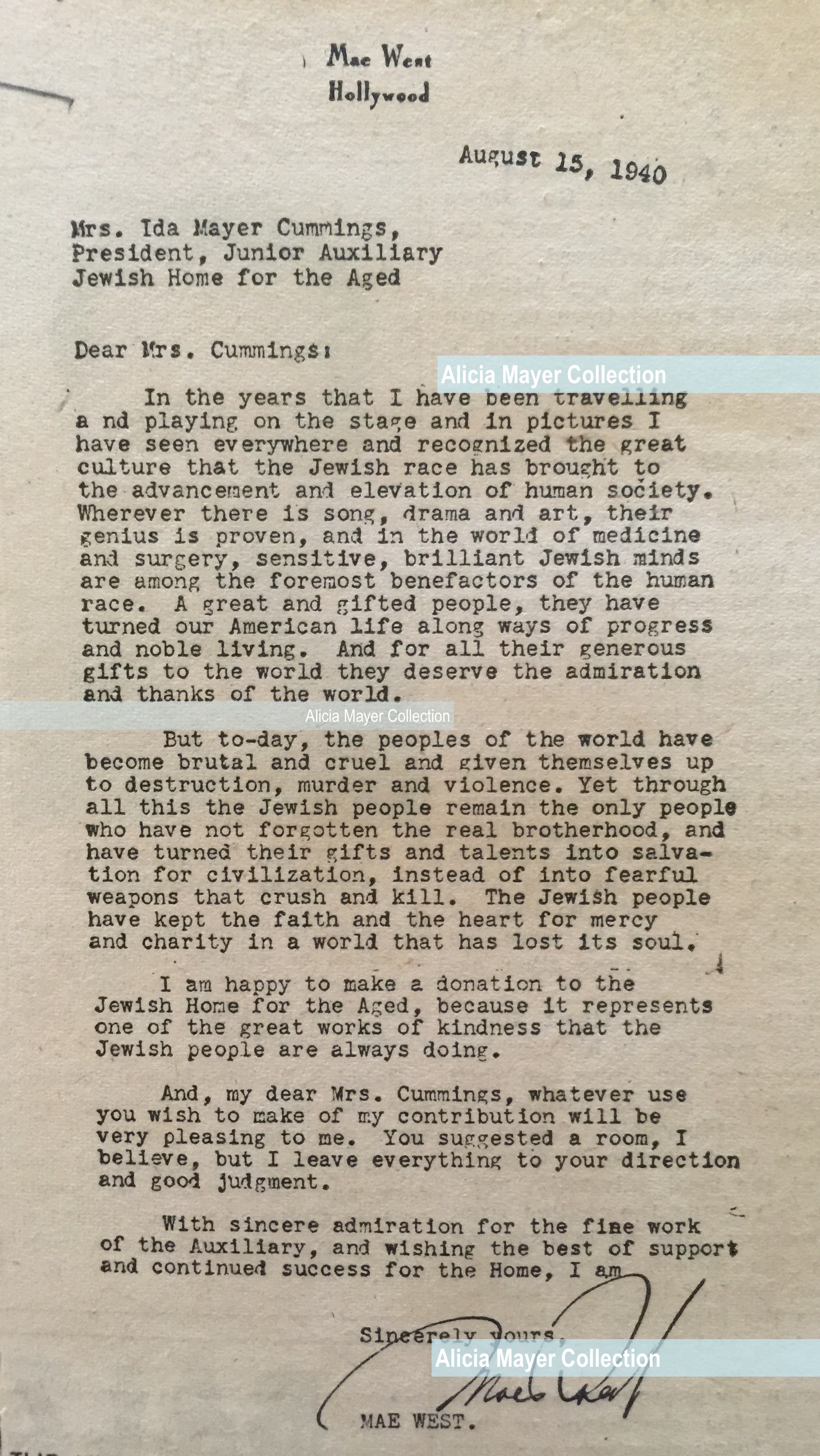 Mae West letter to Ida Aug 1940
